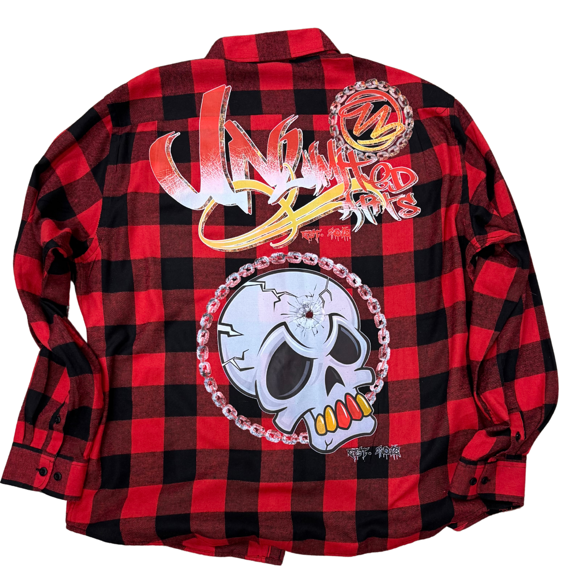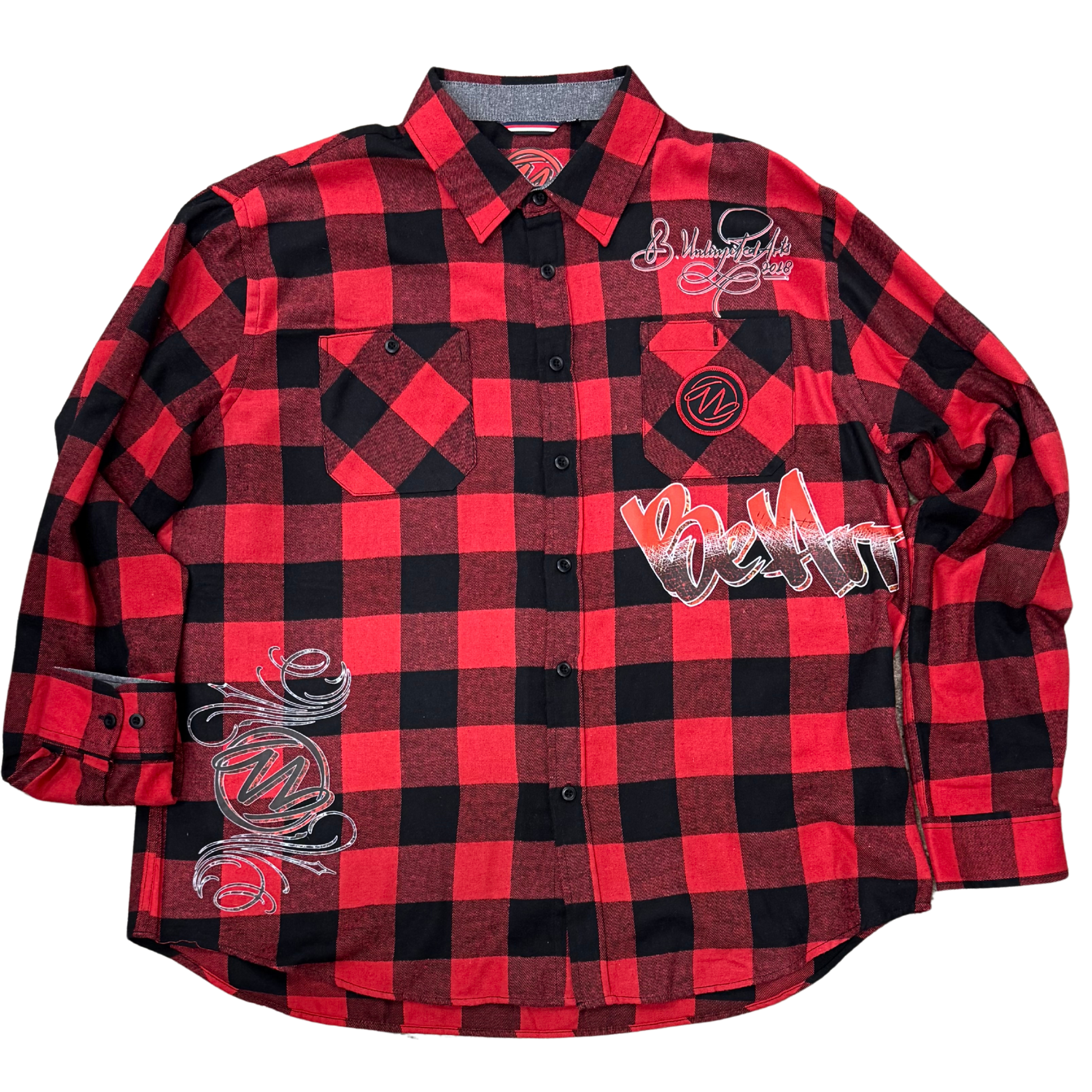 Represent the urban lumberjack look with the Be Art Buffalo Plaid Flannel by Unlimited Clothing! Amazing skull puzzle image on the back and classic Unlimited patch on the front pocket!