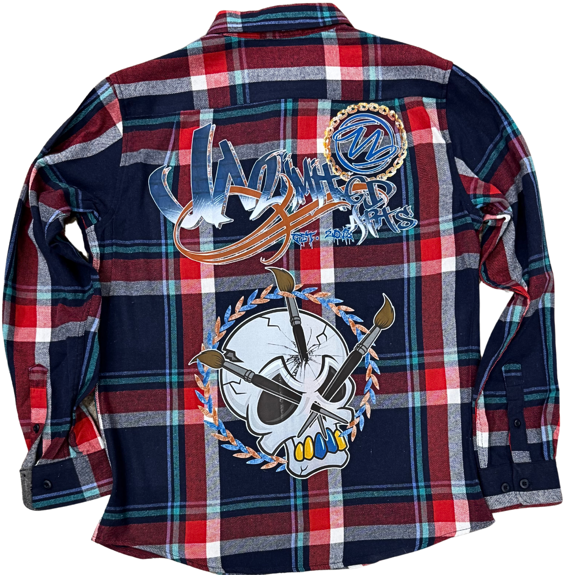 This ain’t your everyday flannel — the BeArt Blue and Red Plaid Shirt is a walking rebellion. With a bold skull graphic pierced by paintbrushes through the eye sockets, this piece screams creative destruction in all the right ways.