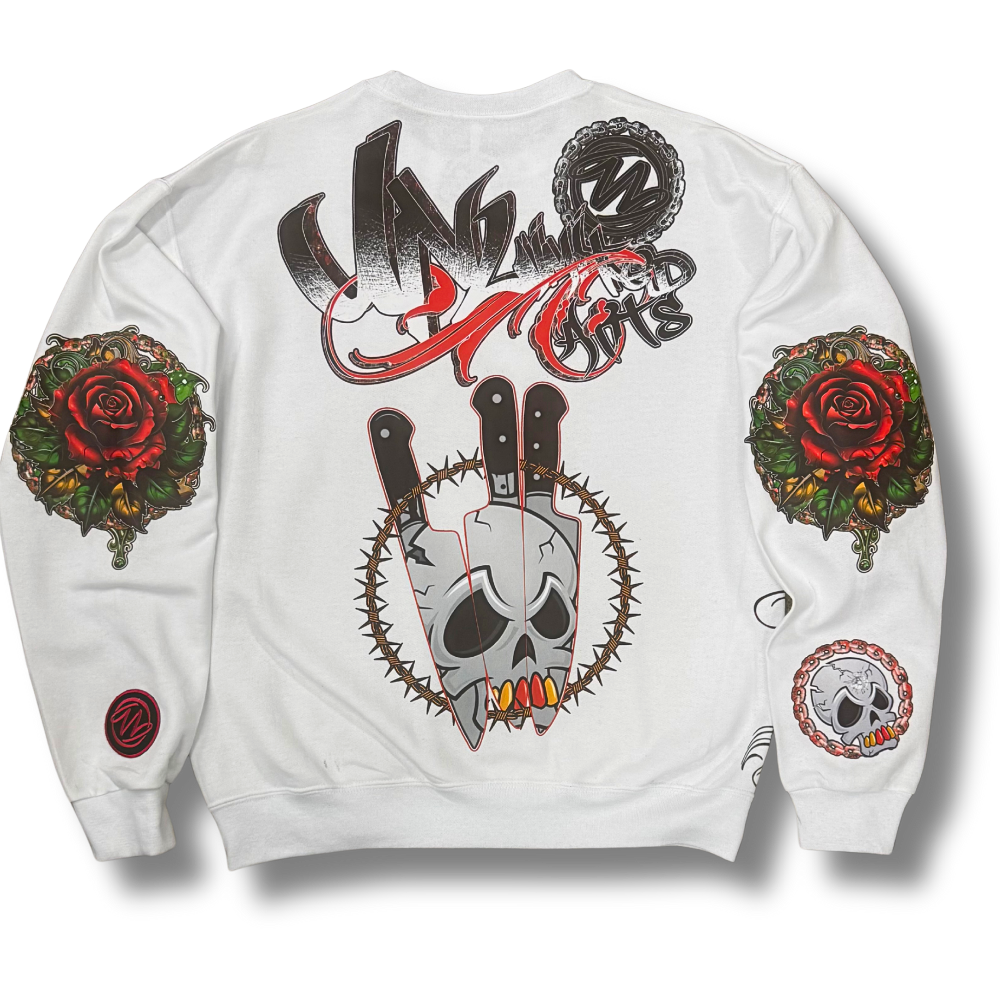Cut from Chaos. Dripped in Detail.Unleash the rebel in you with the BeArt White Crew Neck Sweatshirt — a bold mash-up of artistry and attitude. This isn't just a sweatshirt; it's a statement piece. Featuring a vivid red rose wrapped in barbed chains, paired with a skull, blades, and graffiti-style BeArt logos, every inch is inked with meaning.