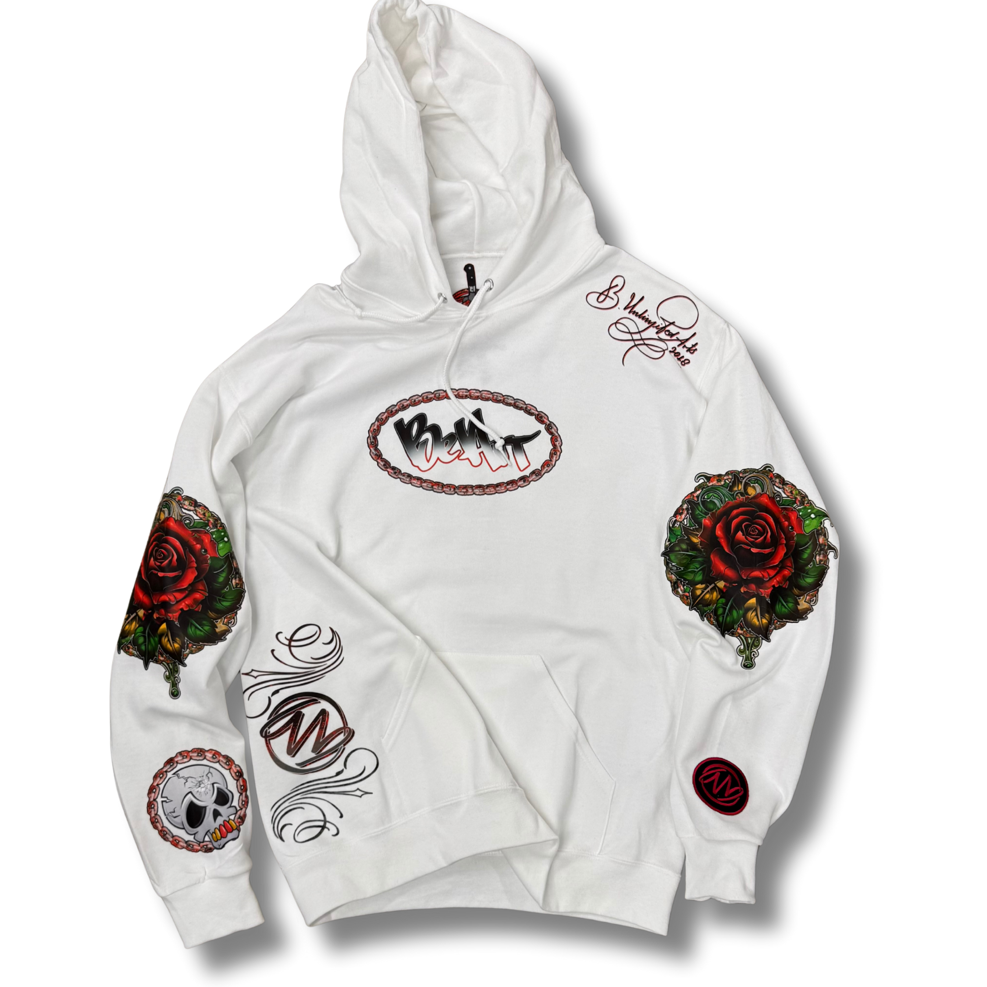 Unleash your daring side with the BeArt White Hooded Sweatshirt — a bold collision of art, rebellion, and street-ready style. This statement piece features an eye-catching red rose graphic wrapped in chain and thorns, paired with a cracked skull, knives, and graffiti-inspired BeArt branding that drips with underground attitude.