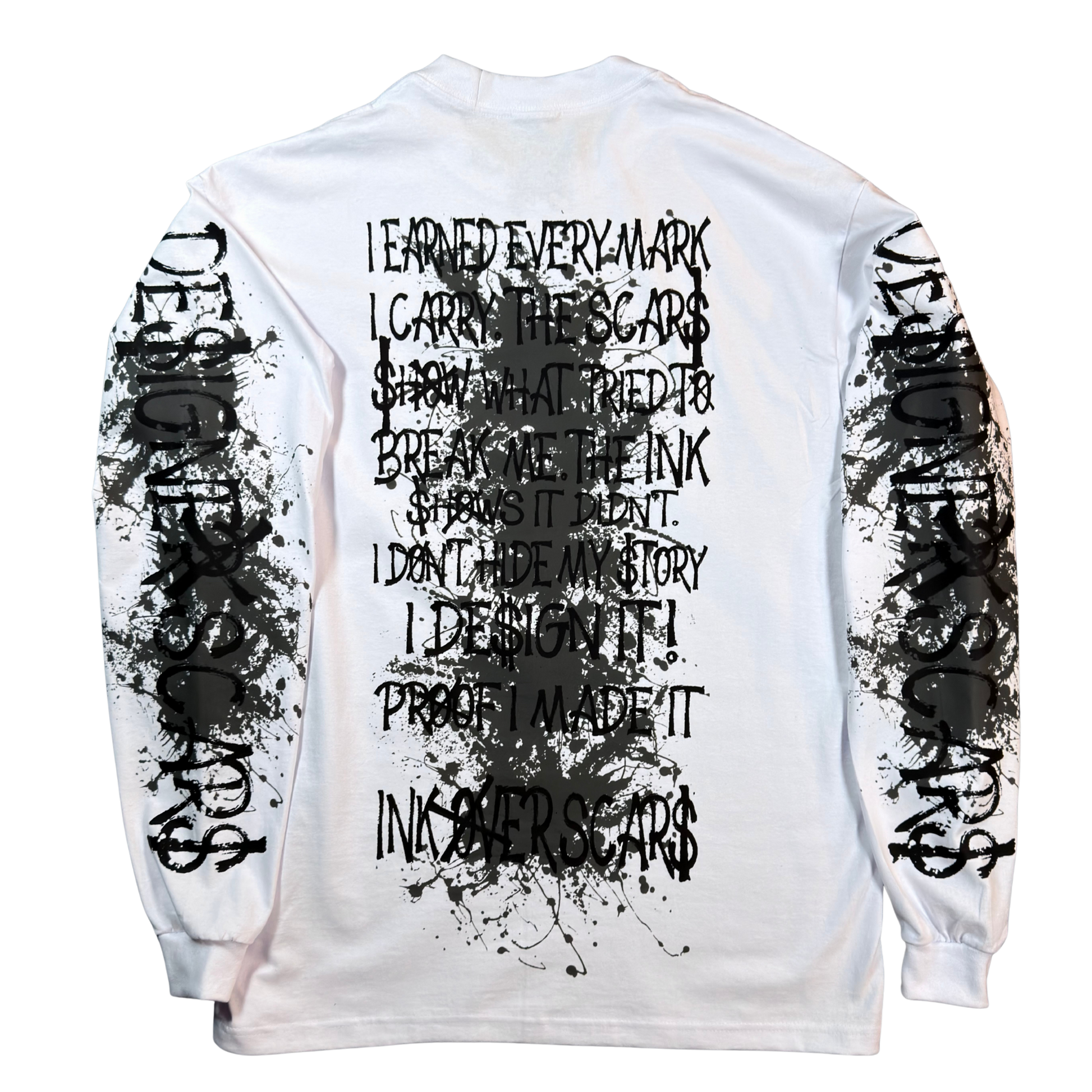 The Ink Over Scars Oversized Long Sleeve T-Shirt blends raw tattoo aesthetics with lived experience. Featuring bold Ink Over Scars graphics across the chest and sleeves, and a powerful manifesto printed down the back, this piece speaks to survival, resilience, and reclaiming your story.