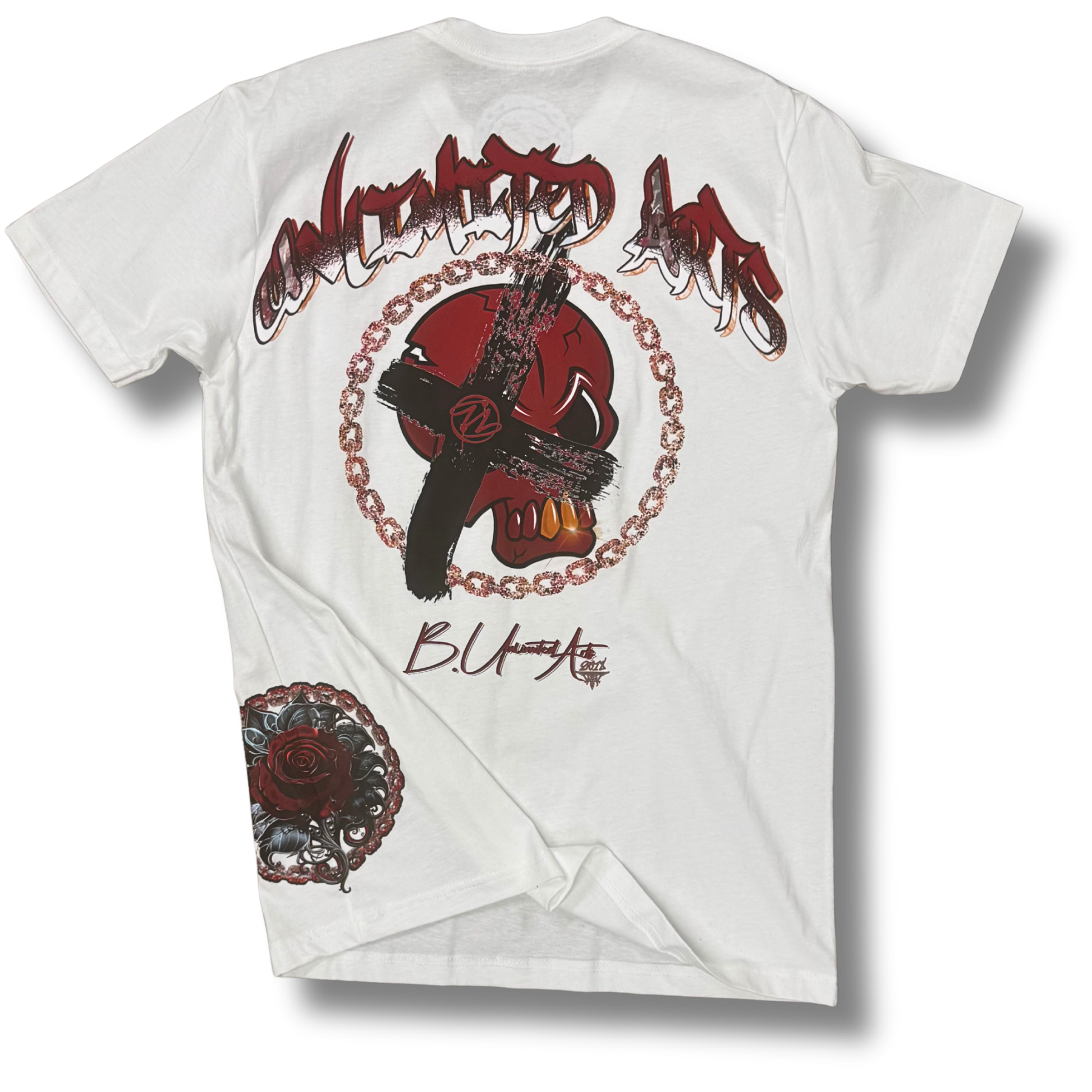 The Cuts Like a Thorn tee isn’t just a shirt — it’s a statement. Featuring a bold burgundy skull with glimmering gold teeth front and center, this piece brings serious attitude to your fit. Clean white fabric lets the design pop hard, giving you that eye-grabbing edge every time you wear it.